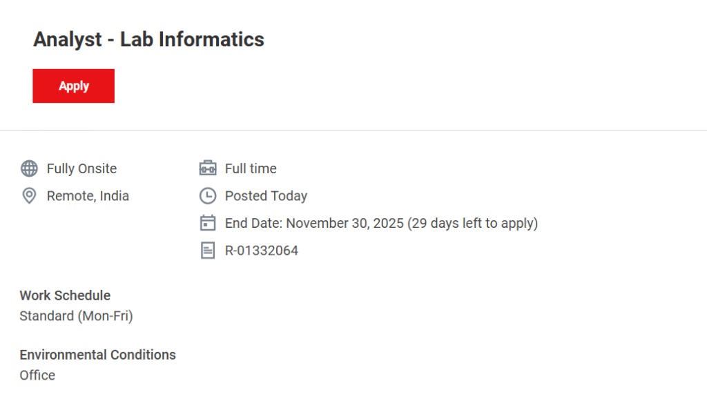 For more information, visit the official careers page and start your journey with Thermo Fisher Scientific — a company that values innovation, collaboration, and scientific excellence. Thermo Fisher Scientific Hiring for Analyst / Lab Informatics