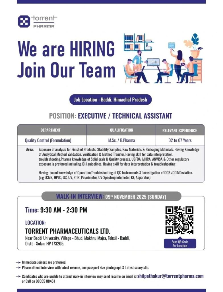 The company is conducting a walk-in interview on Sunday, 9th November 2025, for Executive and Technical Assistant positions in the QC (Formulation) department. Candidates with relevant experience and qualifications are encouraged to attend and become part of a reputed organization recognized for its commitment to innovation, quality, and global regulatory standards. Torrent Pharma Hiring for Executive / Technical Assistant / QC