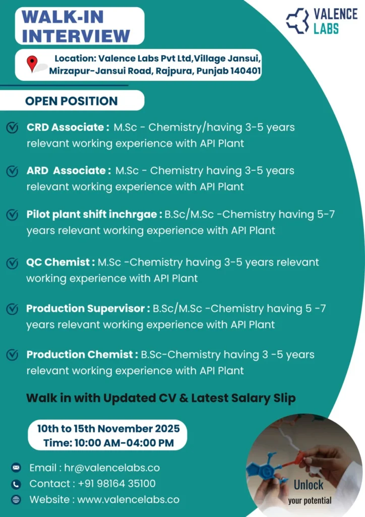Valence Labs is conducting walk-in interviews from November 10 to November 15, 2025, for multiple openings in Chemical Research & Development (CRD), Analytical Research & Development (ARD), Quality Control (QC), and Production Departments. Valence Labs Hiring for CRD / ARD Associate / QC / Production