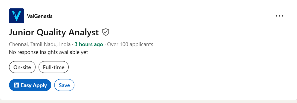 ValGenesis is a global leader in digital validation and quality management systems designed specifically for the life sciences industry. Founded with the goal of helping pharmaceutical and biotechnology companies achieve paperless validation, ValGenesis has now become a trusted digital partner for more than 30 of the top 50 global pharma and biotech companies. The company continues to drive innovation in compliance, process automation, and manufacturing excellence through its world-class digital platforms. ValGenesis Hiring for Junior Quality Analyst