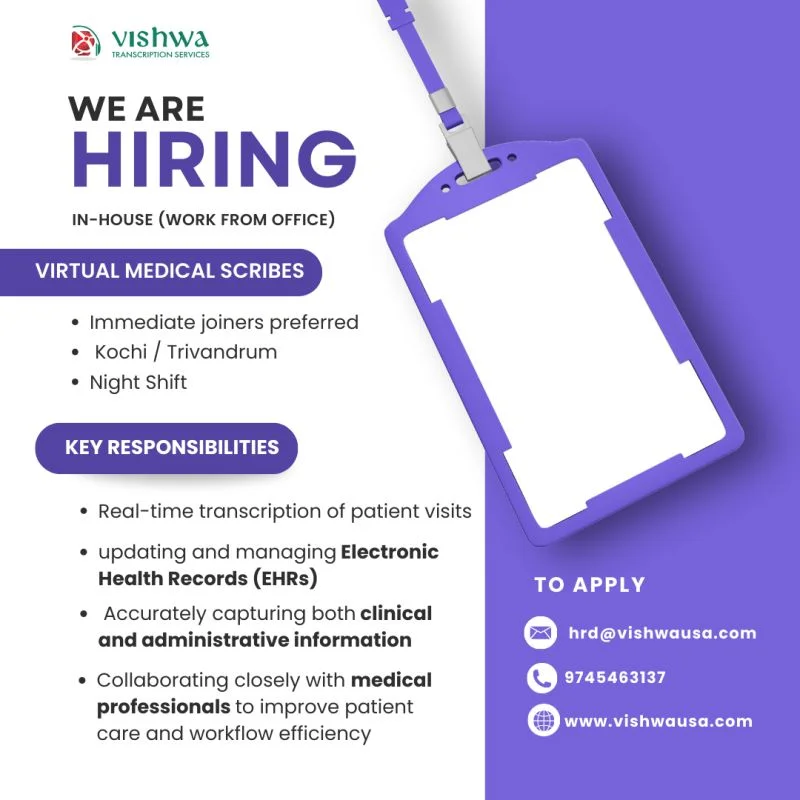 Vishwa is inviting applications for Virtual Medical Scribe (Live Scribing) positions for its in-house healthcare documentation teams based in Kochi and Trivandrum. This role is ideal for candidates with experience or strong interest in medical documentation, electronic health records, and clinical transcription. Vishwa Hiring for Virtual Medical Scribe roles