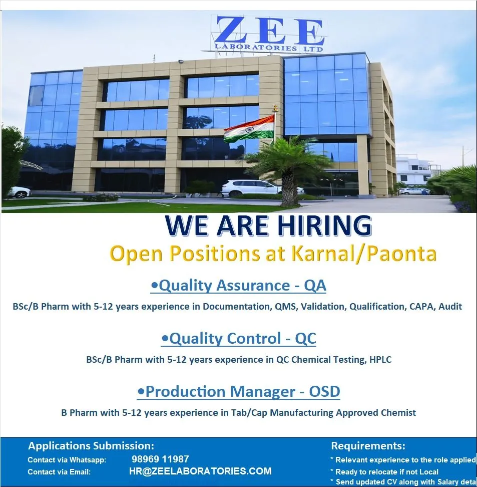 Zee Laboratories Limited is one of India’s leading pharmaceutical companies, known for its strong presence in both domestic and international markets. With a commitment to innovation, quality, and global standards, Zee Labs manufactures a wide range of products across multiple therapeutic categories. Zee Laboratories Hiring for QA / QC / Production
