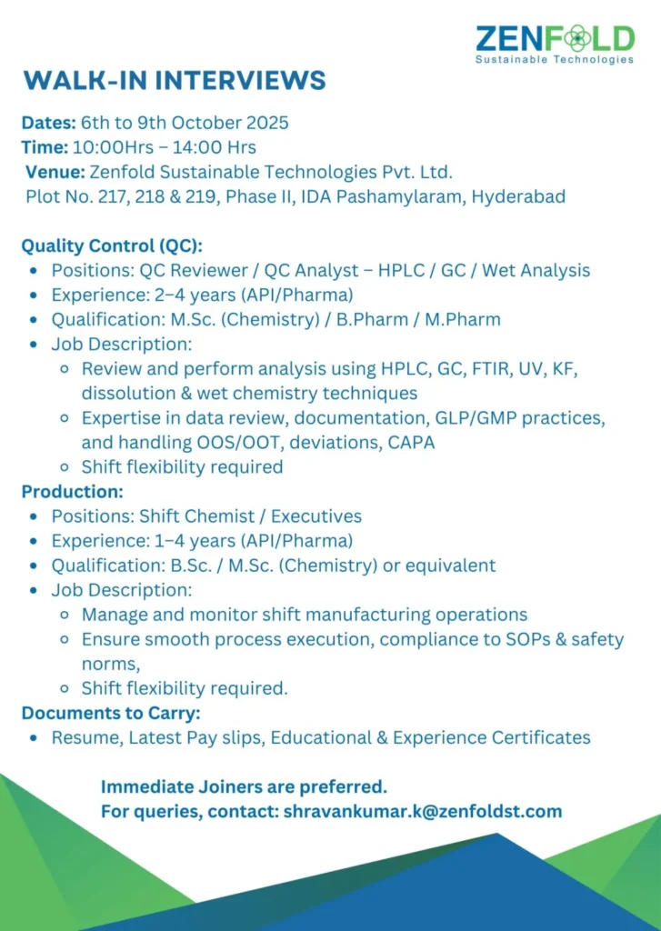 As part of its continued growth, Zenfold is conducting walk-in interviews for talented professionals in Quality Control (QC) and Production departments. If you have the right experience, skills, and passion for quality and innovation, this is your opportunity to join one of India’s fastest-growing sustainable pharma organizations. Zenfold Sustainable Hiring for Quality Control / Production