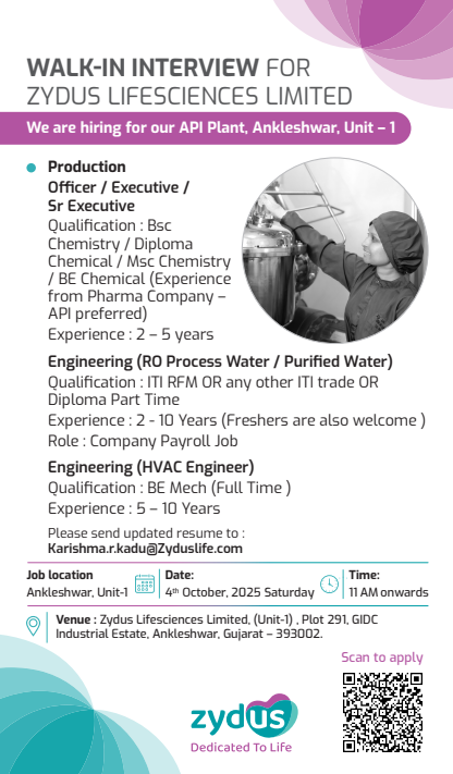 Zydus Lifesciences hiring Production & Engineering professionals at Ankleshwar API plant. Walk-in interview on October 4, 2025. Apply now.