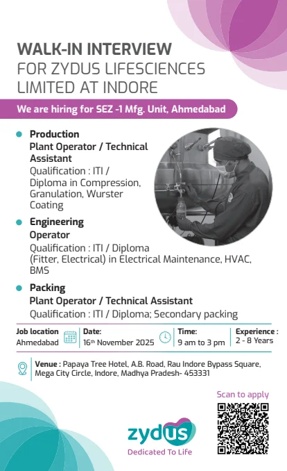 Donโt miss the chance to join a reputed pharma companyโattend the Zydus Lifesciences walk-in interview in Indore on 16th November 2025.
