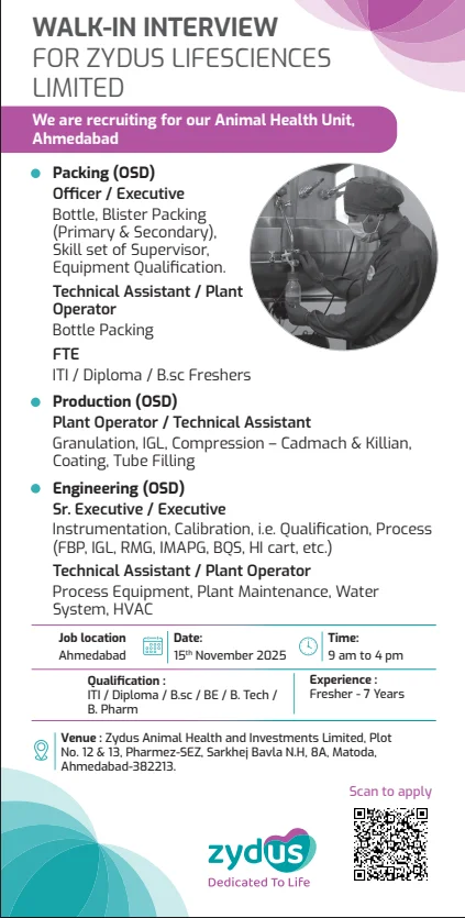 Attend the walk-in interview directly at the Zydus Animal Health Unit, Matoda, Ahmedabad, between 9:00 AM – 4:00 PM on November 15, 2025. - Pre-register Online: